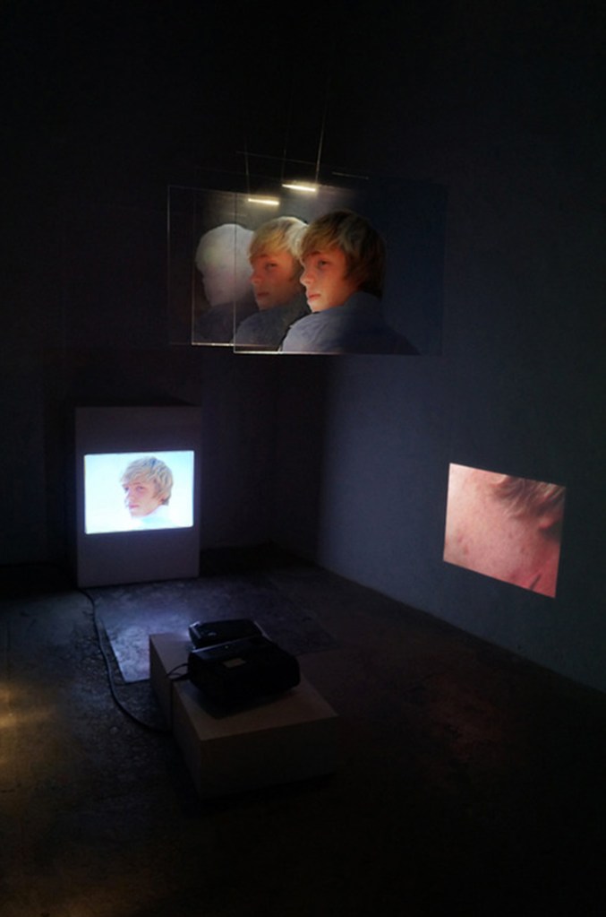 Qui me regarde Impressions sur plexiglas, vidéo, super 8 (boucles) – 2013 Boucle temporelle entre les trois éléments de l’installation, apparition sans fin du visage souriant d’un adolescent qui se retourne sans cesse, jusqu’à la blessure.